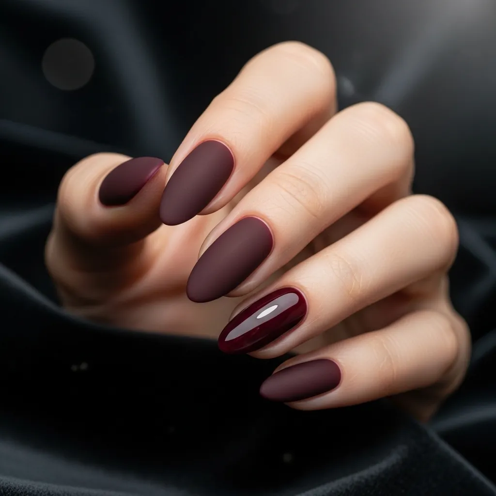• Matte burgundy almond nails