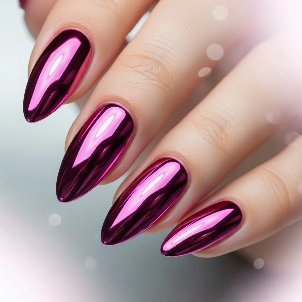 Pink chrome nails reflect light beautifully. They create a mirror-like effect that looks incredible in photos.