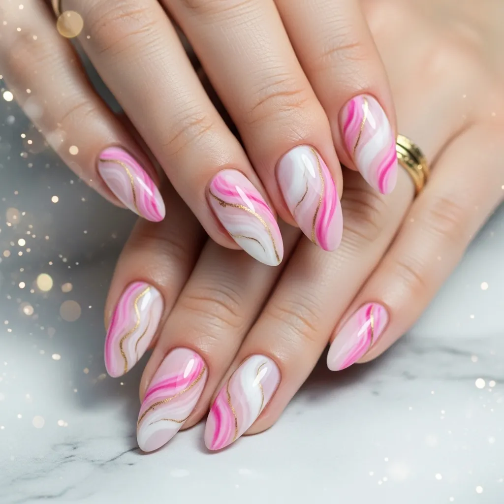 Marble designs combine pink, white, and gold veins. The result looks similar to marble stone textures.