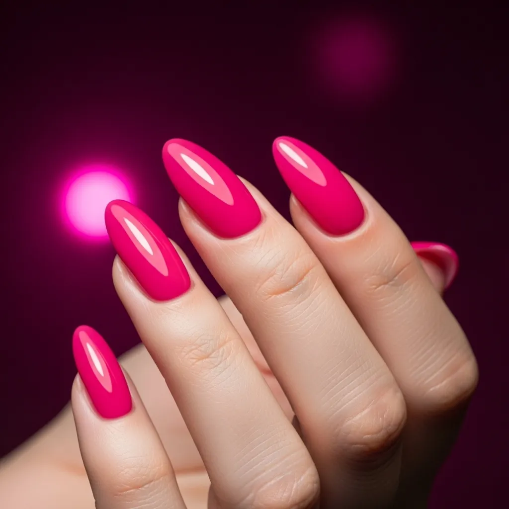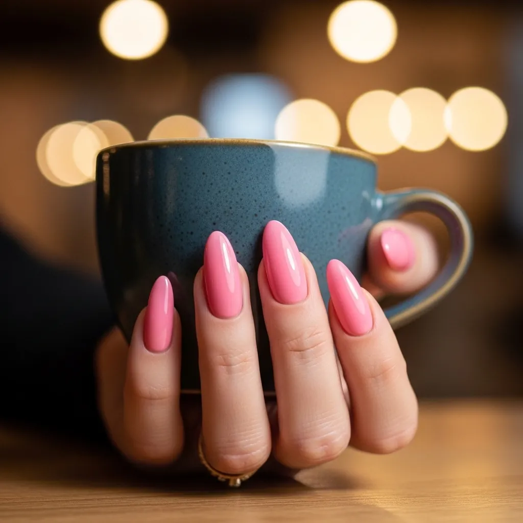Hot pink almond nails bring energy and confidence. They instantly turn a simple manicure into a bold fashion accessory.