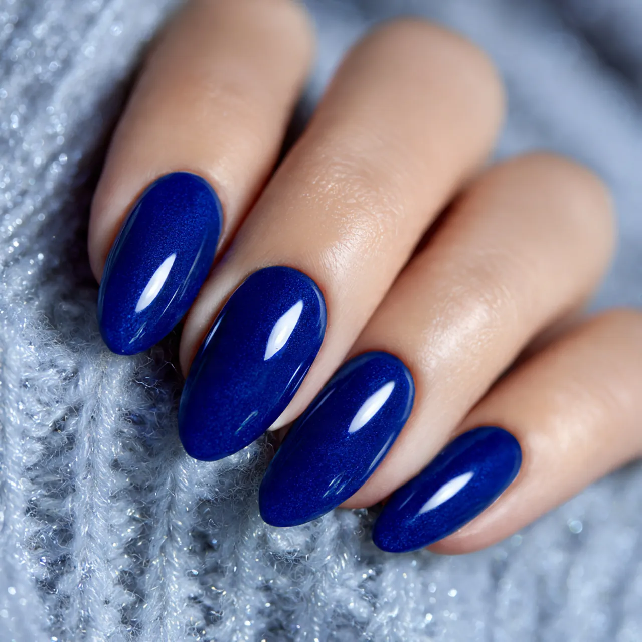 A blue-toned polish styled on an oval shape for a modern look.