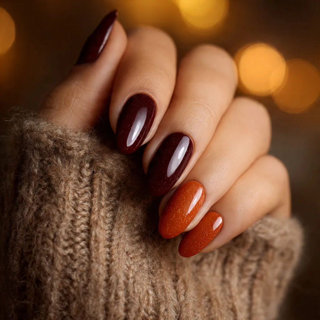 Autumn Nails Oval usually feature shades like burnt orange, deep burgundy, chocolate brown, or muted olive. The oval shape softens these rich tones so they feel elegant instead of heavy.