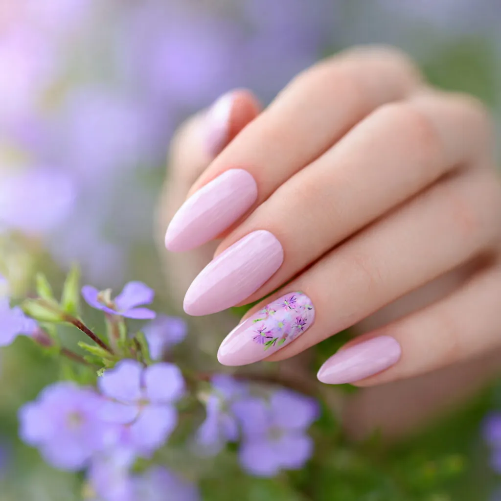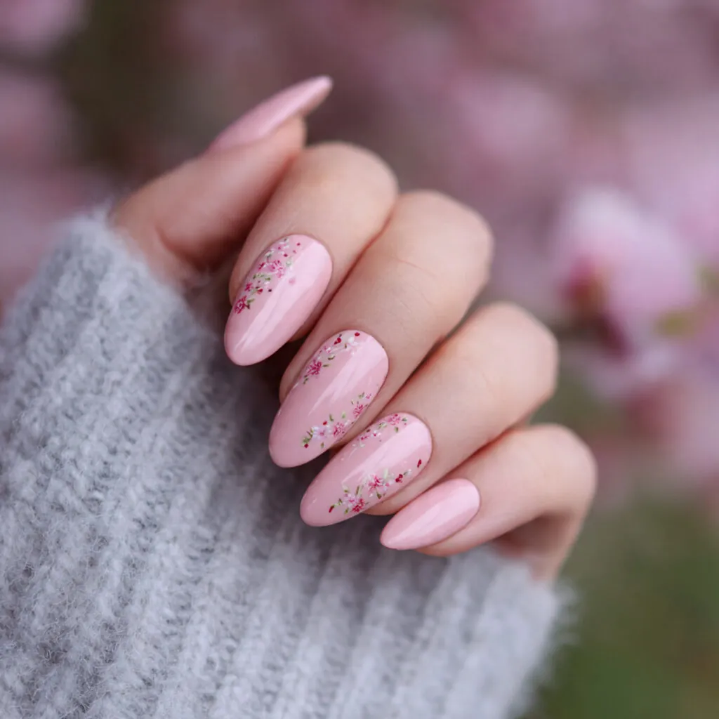 Placement and scale are key. Small, well-spaced flowers look refined. Overcrowded floral designs can feel heavy and reduce elegance. The curved surface of almond nails complements floral flow beautifully.