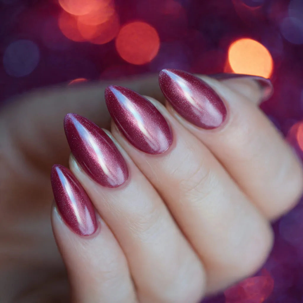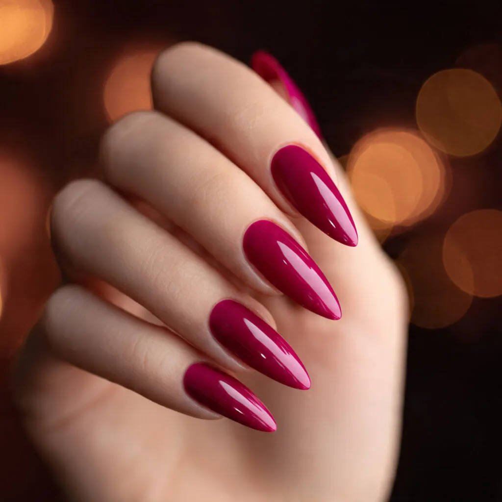 Dark pink nails create contrast and drama while remaining feminine. On coffin and stiletto shapes, they look bold and structured. On shorter nails, they appear elegant and compact.