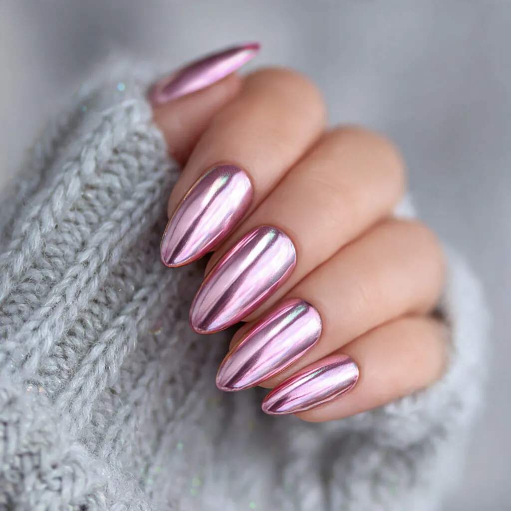 Light pink nails with design are about refinement. The base shade is gentle and close to nude, so artwork must remain delicate. Fine white lines, tiny crystals, minimalist florals, or soft chrome accents work beautifully. Almond and oval shapes allow designs to flow naturally, while short square nails keep the look modern.