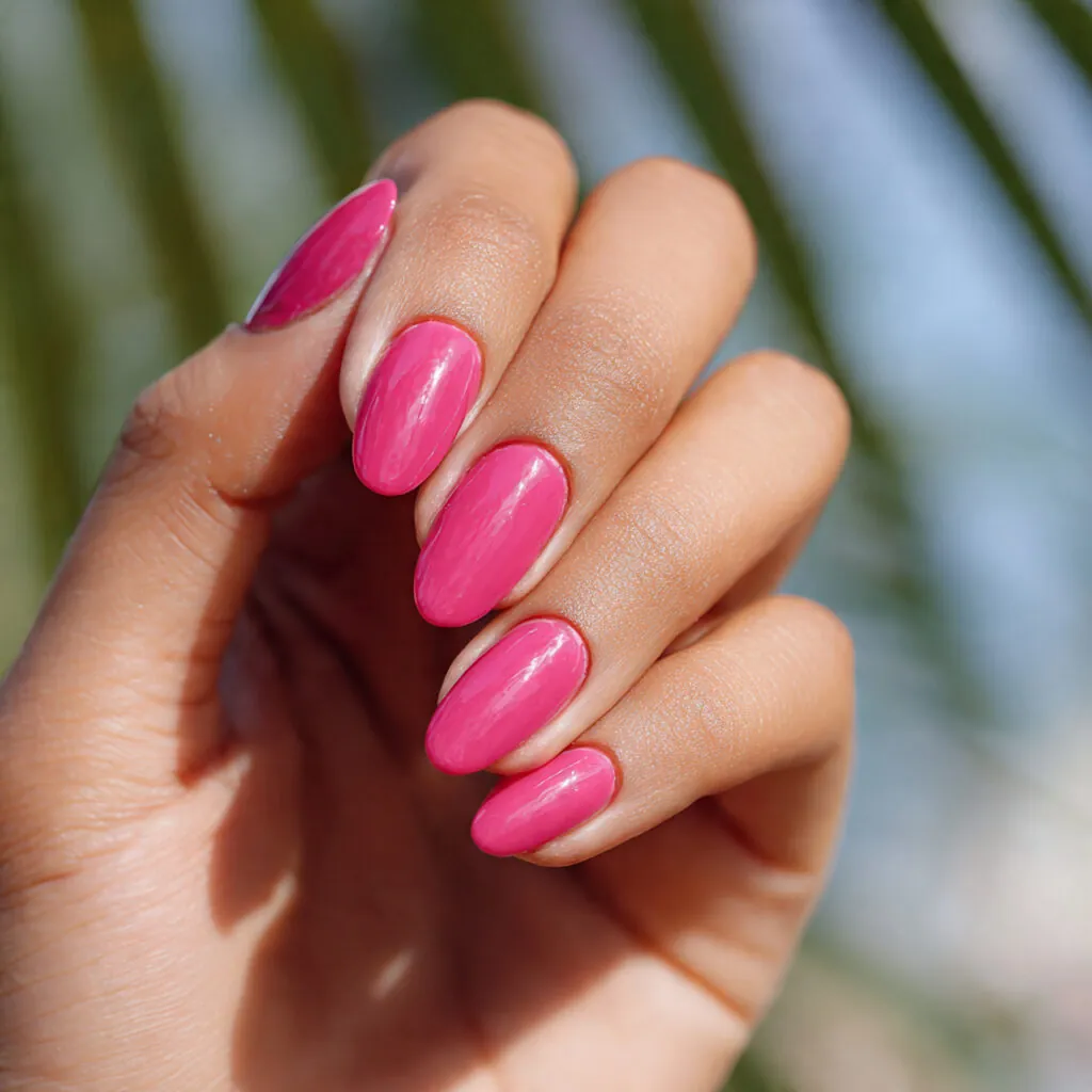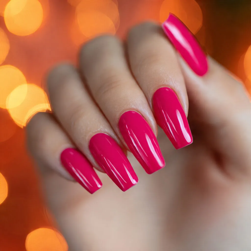 This shade works beautifully in glossy finishes. Matte hot pink feels modern but slightly softer. Because it’s vibrant, chips can be noticeable if not sealed properly.