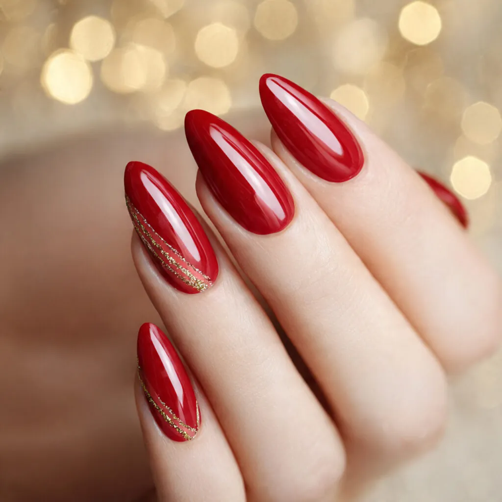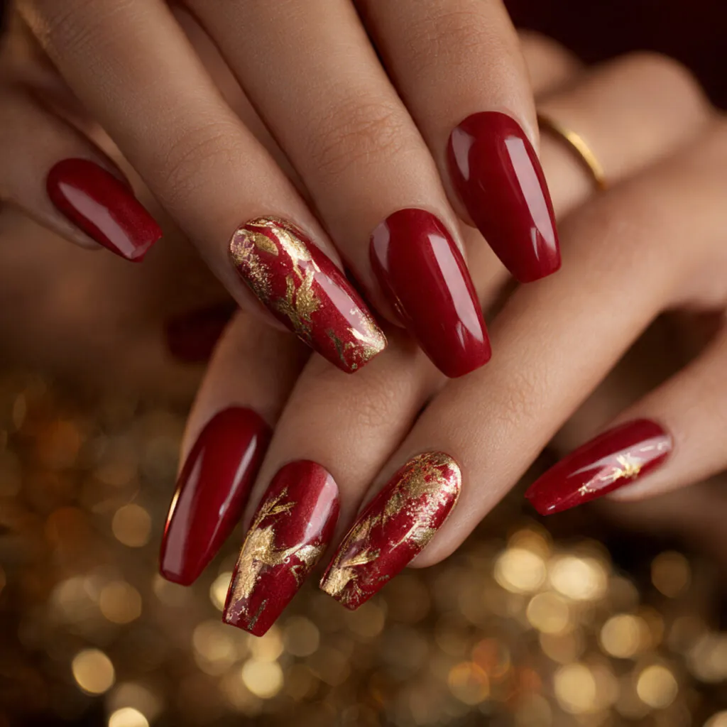 Red and gold nails feel luxurious. The warmth of gold enhances red’s richness.