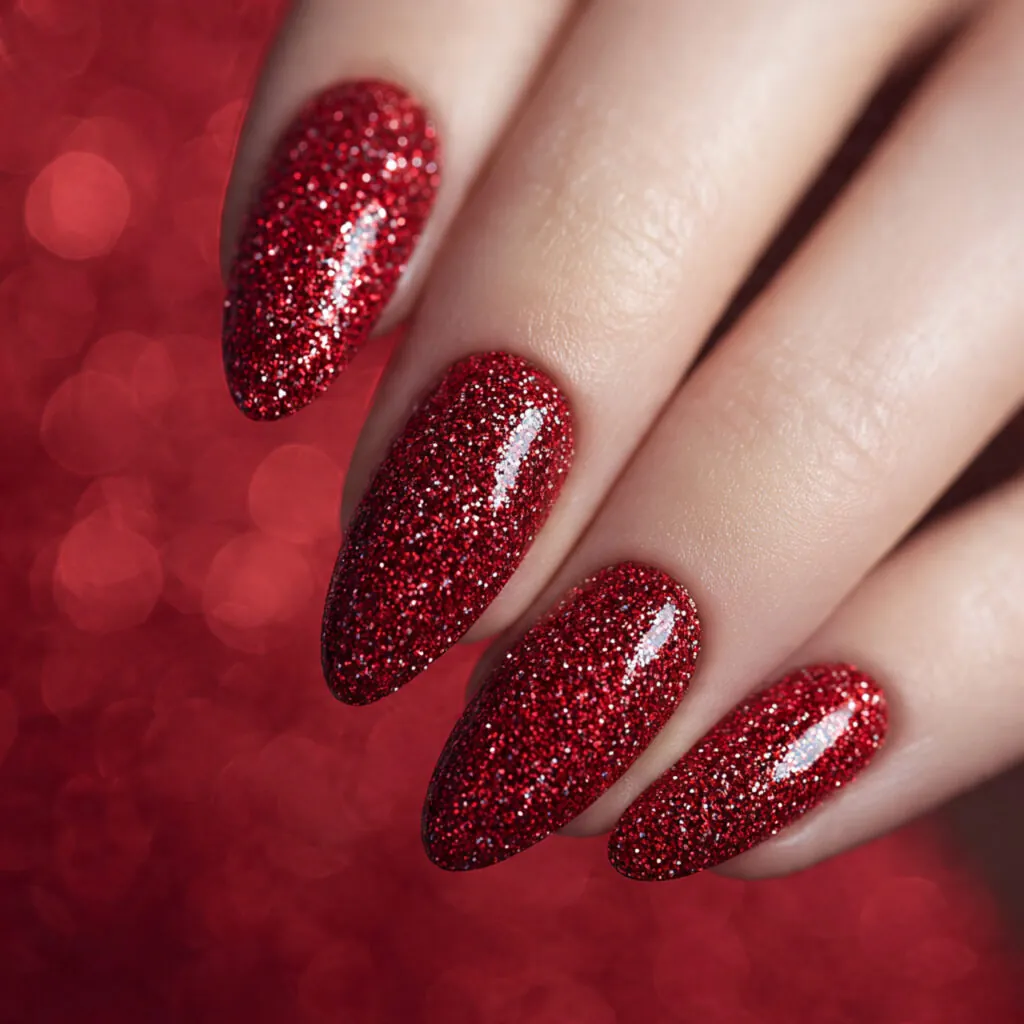 Red glitter nails add texture and sparkle. Fine glitter looks elegant; chunky glitter feels bold.