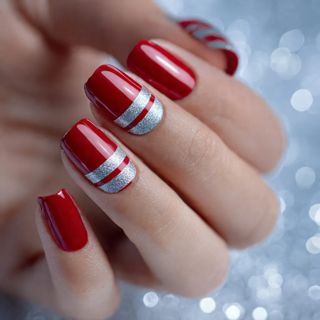 Red and silver nails feel crisp and contemporary. Silver cools down the warmth of red.