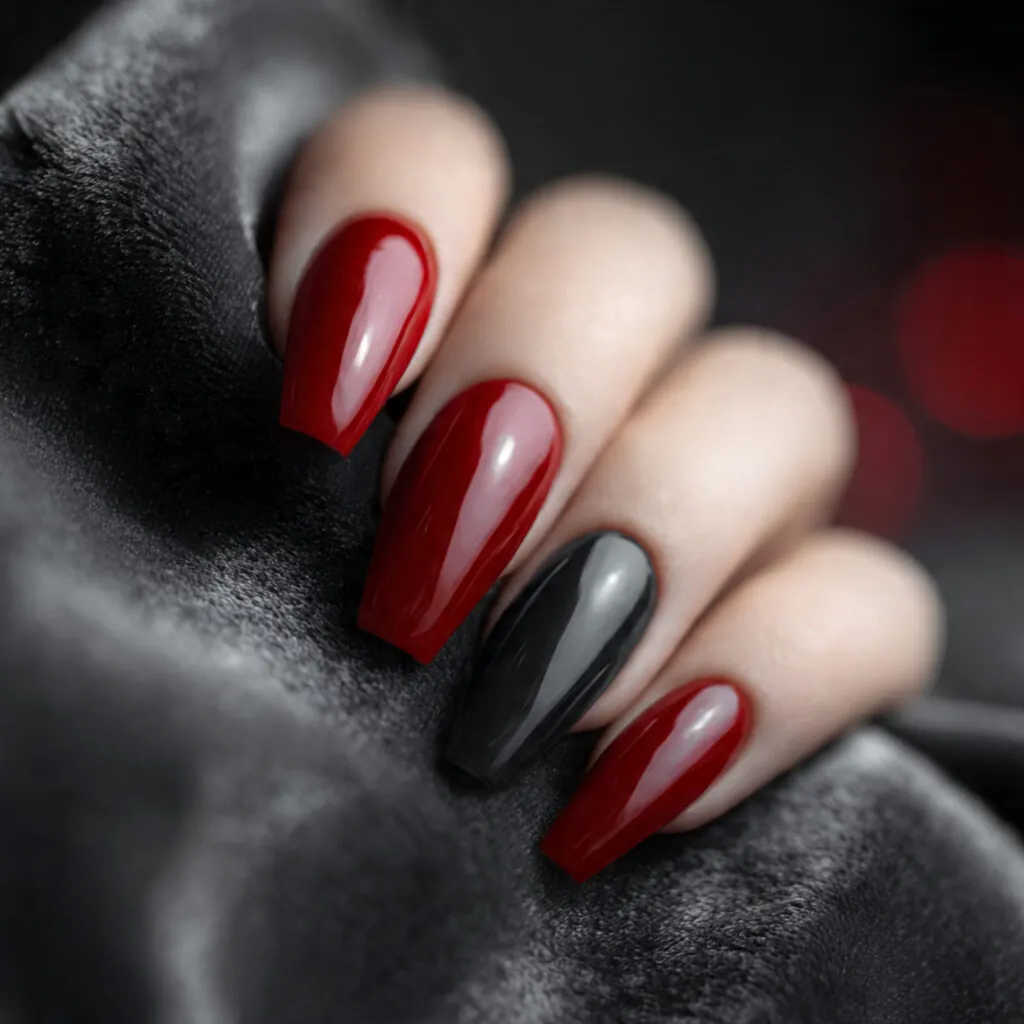 Black and red nails create intensity. Placement determines mood—half-and-half feels modern; gradients feel edgy.