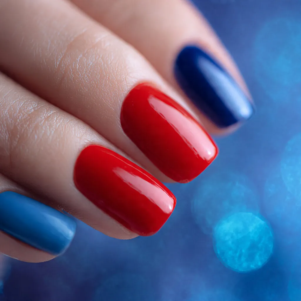 Red and blue nails can feel vibrant or dramatic depending on shade depth.