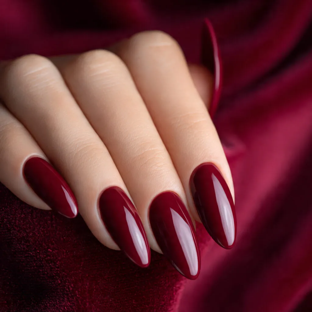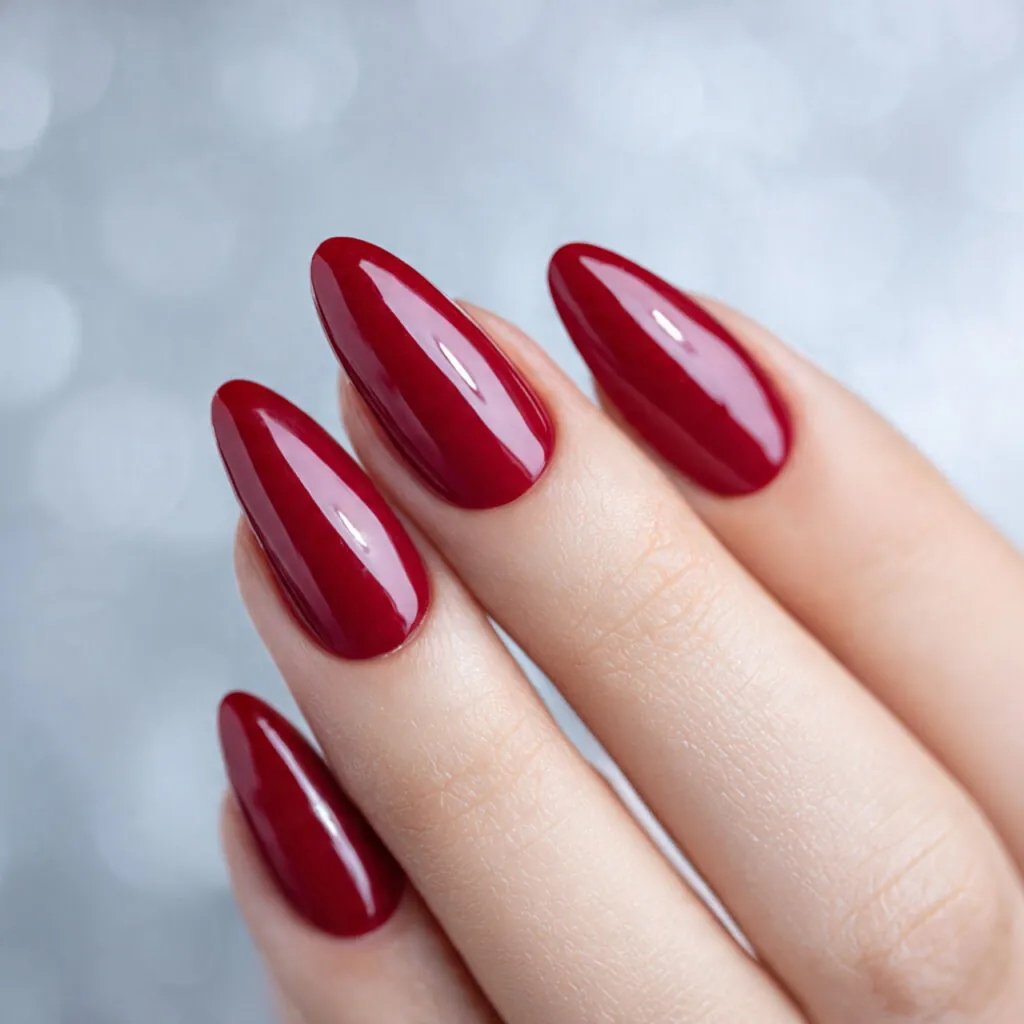 Dark red nails feel rich and mature. They elongate the fingers and look especially striking on almond or coffin shapes.