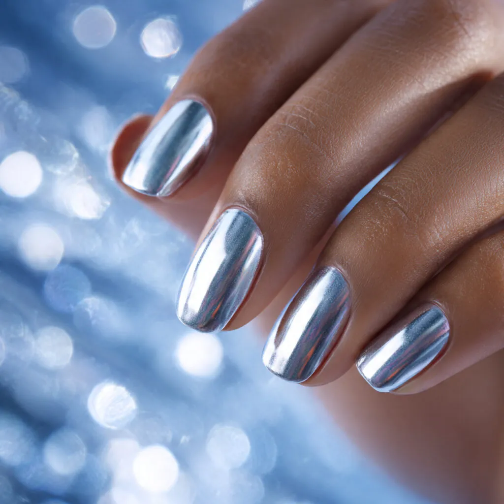 Chrome on long nails can look dramatic. Chrome on short square nails? It looks futuristic but wearable.